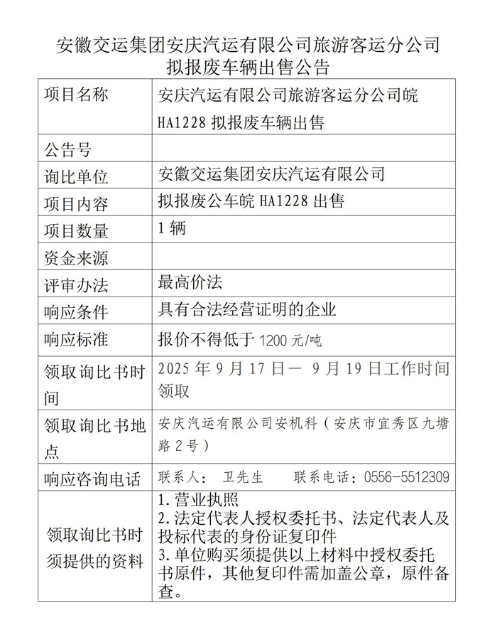 旅游客運分公司擬報廢車輛出售公告