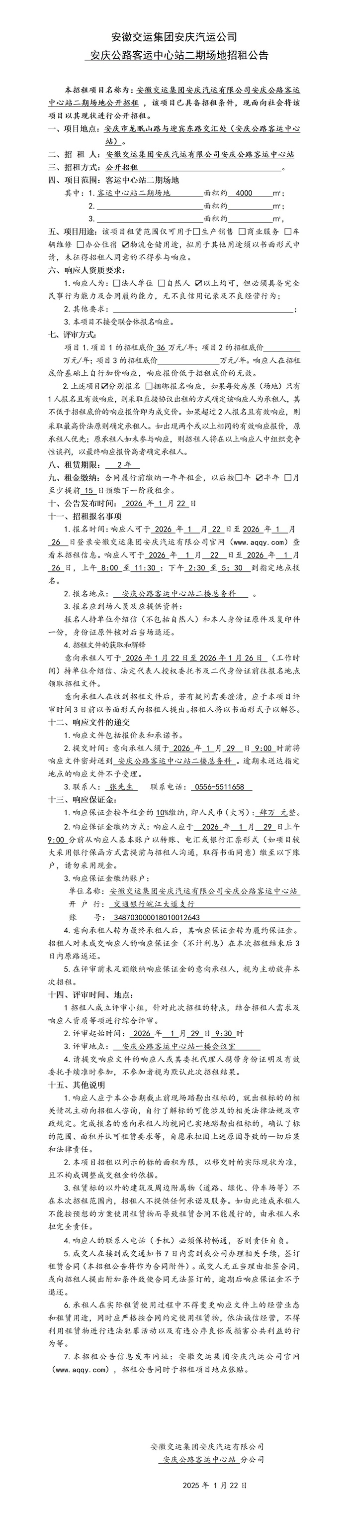 安慶公路客運(yùn)中心站二期場(chǎng)地招租公告